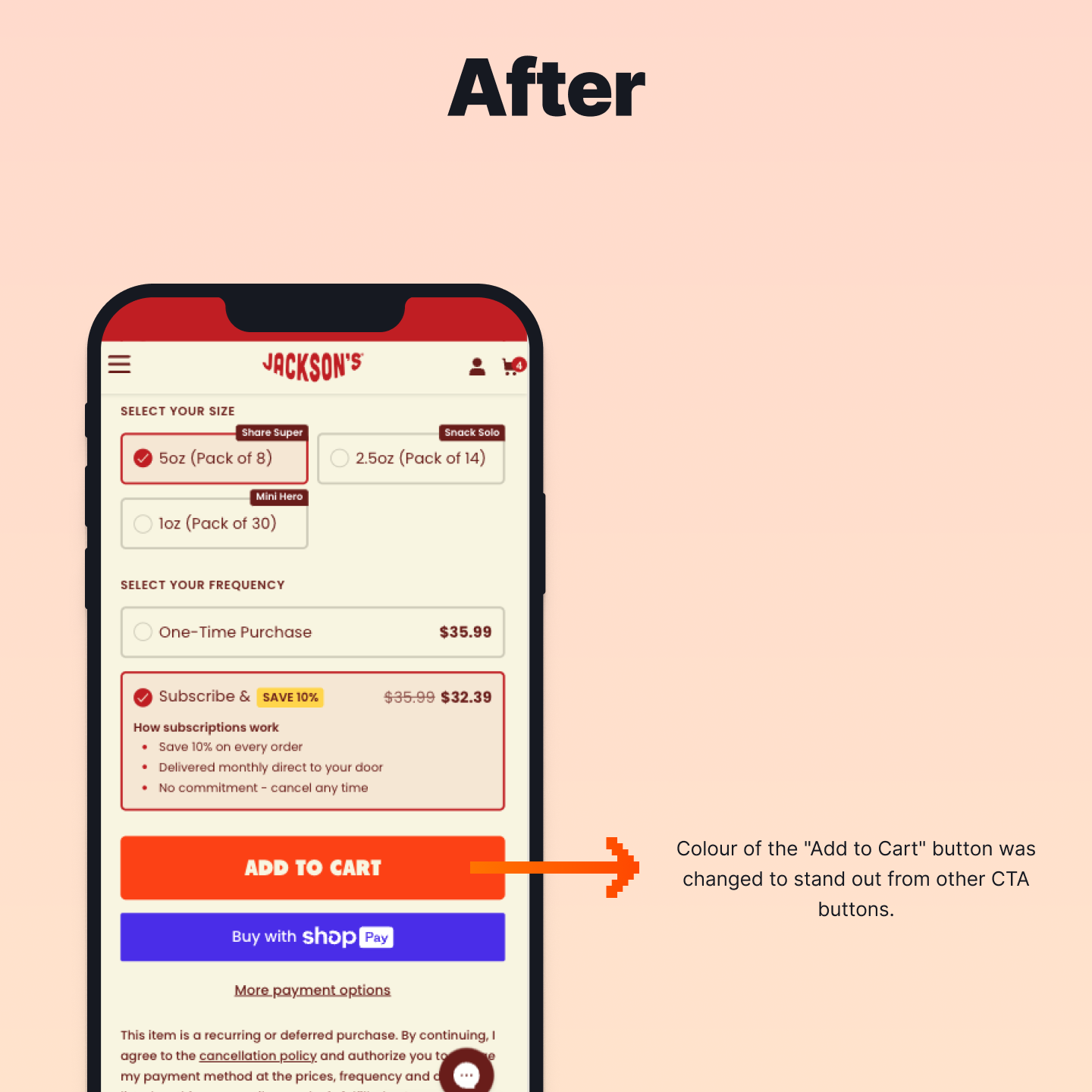 When changing the colour of the Add to Cart CTA button, we observed an overall +8.14% increase in clicks on Add to Cart, and an 18.40% increase in eCommerce Conversion Rate. We set Variant 1 live permanently. We also observed a +66% increase in Clicks on Add to Cart, 5% increase in eCommerce Conversion Rate, a +10% increase in AOV, and a +16.40% increase in Average Purchase Revenue per User, all for New Visitors. We implemented Variant 1 permanently.