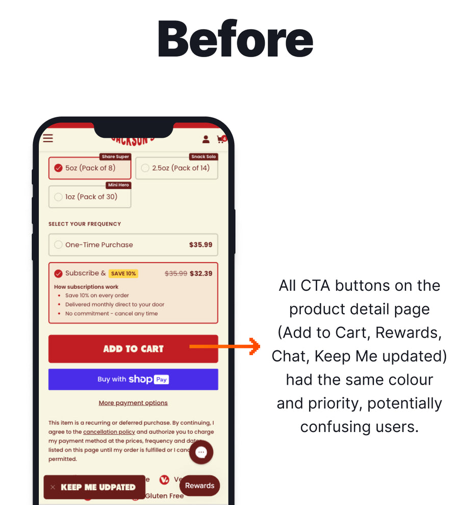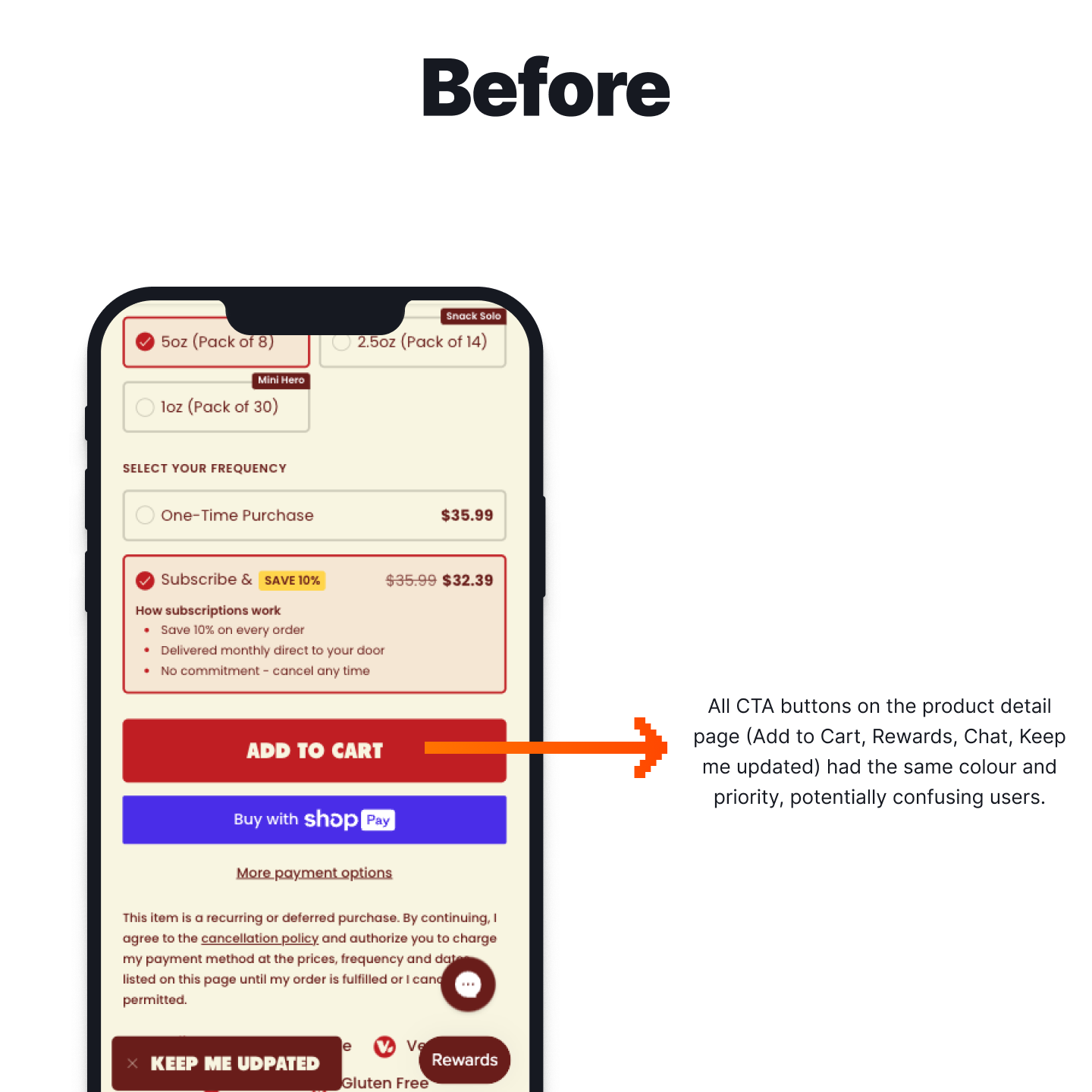 During the CRO audit we conducted for the brand, we noticed that all CTA buttons on product detail pages like Add to Cart, Rewards, Chat, and Keep Me Updated, were presented in the same colour and priority. We hypothesised that this could make it difficult for users to understand which CTA to use to proceed to the next step.