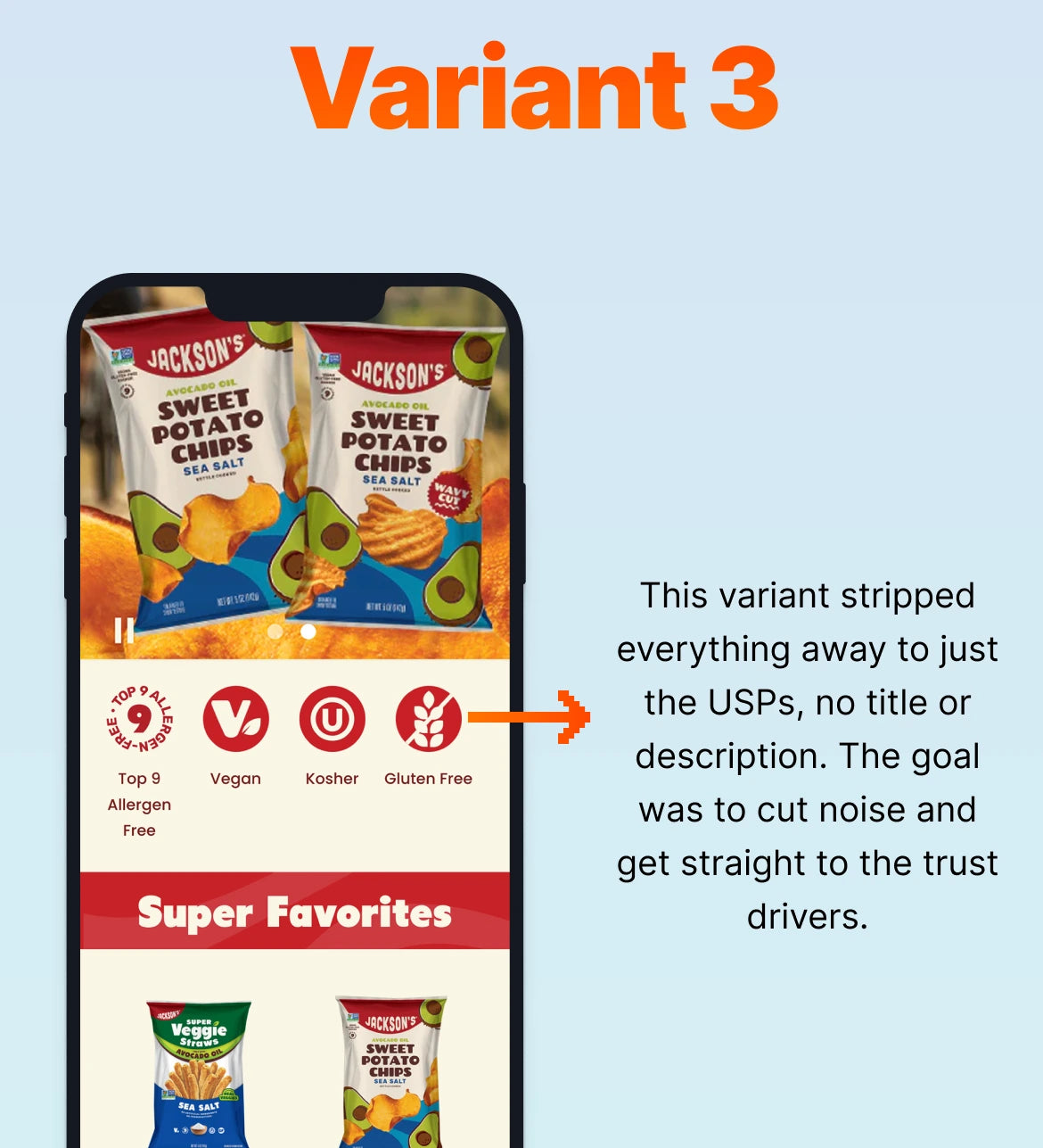After two weeks, the test results demonstrated that Variant 1 consistently outperformed other variants across mobile and desktop platforms, showcasing significant increases in key metrics such as 225% increase in Conversion Rate and 66% increase in Average Purchase Revenue per User overall. This variant also drove higher engagement with an 88% increase in Average Products per Visitor and a 56% uplift in clicks on the Add to Cart. While Variant 2 showed competitive results in revenue performance for desktop users (an increase of 251%), its overall impact was less robust than Variant 1. Variant 3 underperformed in several critical areas, with revenue and PDP visit declining, making it less favourable for implementation.