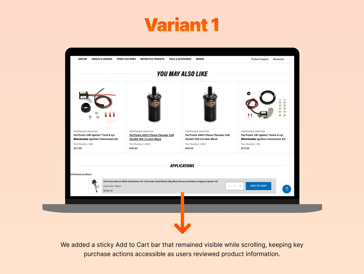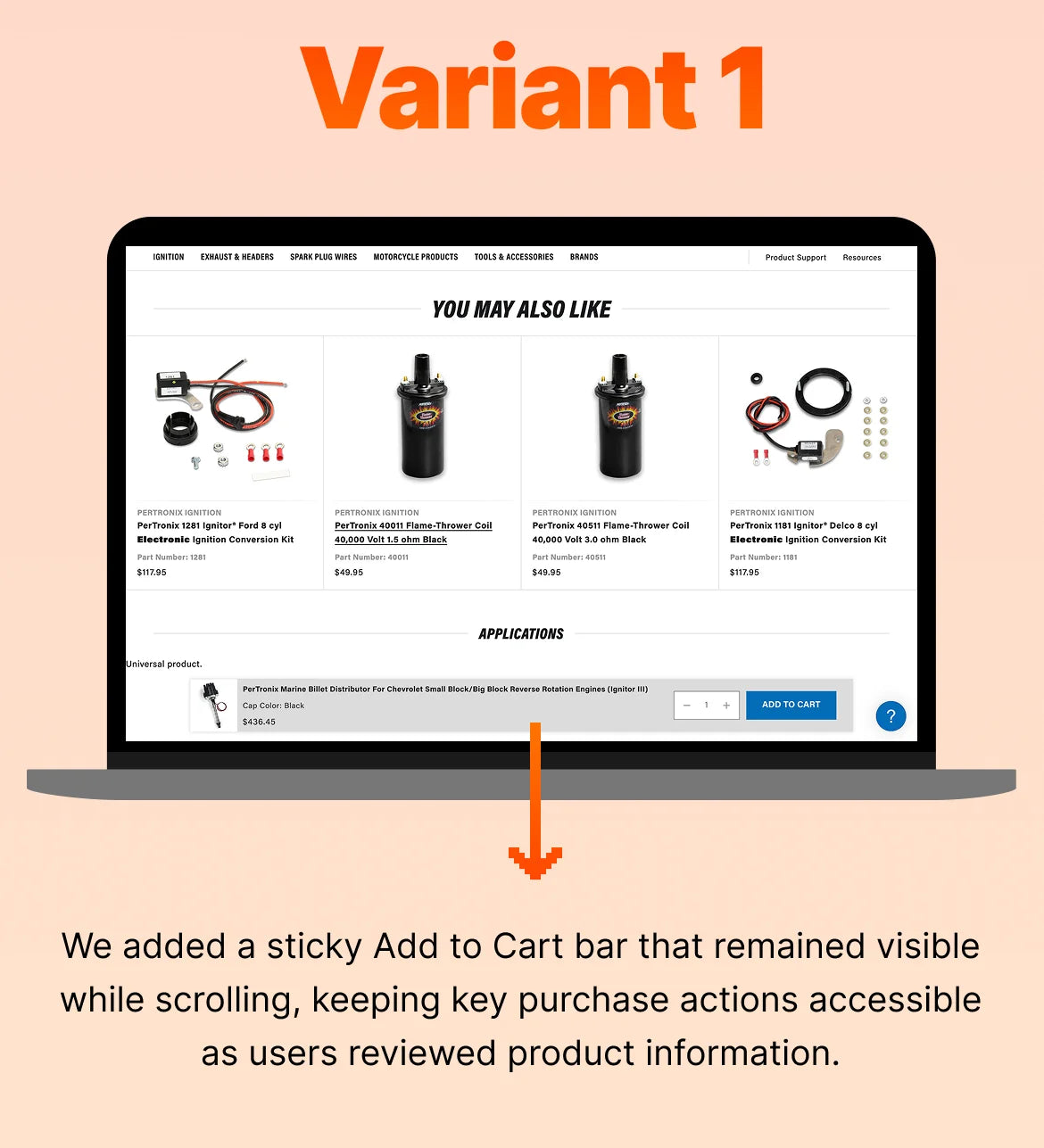 The sticky Add to Cart bar delivered strong uplifts across both engagement and revenue metrics, indicating that users were able to read through all the required information and add products to their carts immediately without having to scroll back to the Add to Cart CTA. Conversion Rate increased by +25.95%, while Revenue per Visitor rose by +25% and Total Revenue by +29.9%. The improvement suggested that maintaining persistent action visibility preserved conversion momentum, enabling users to act immediately once information needs were satisfied.