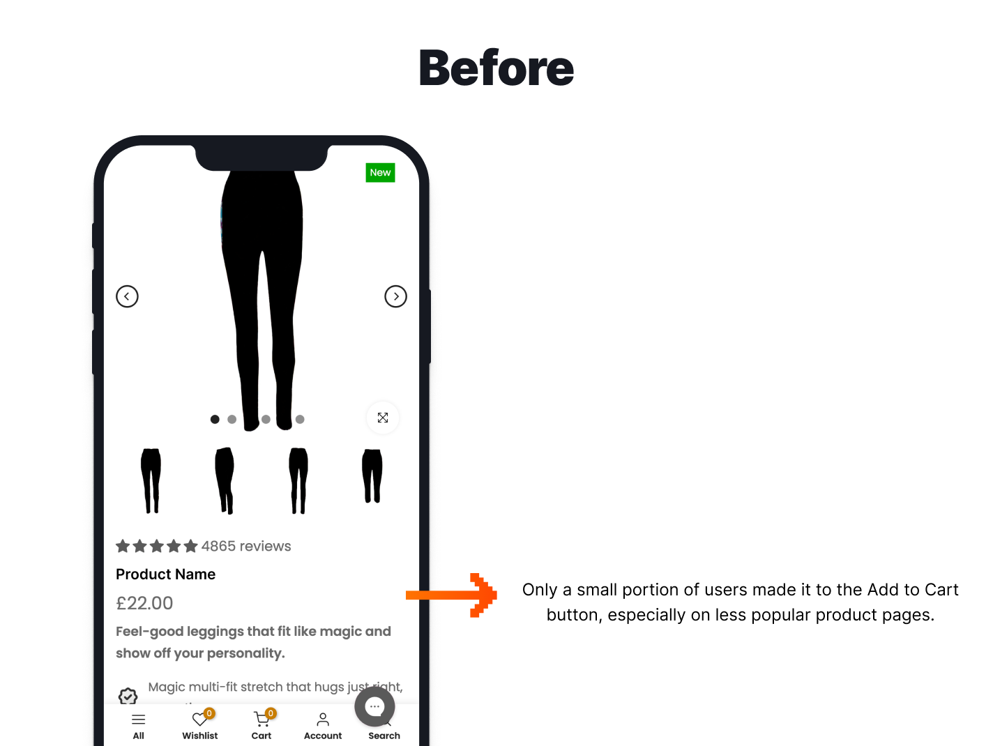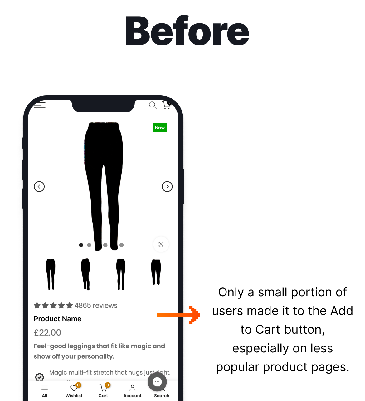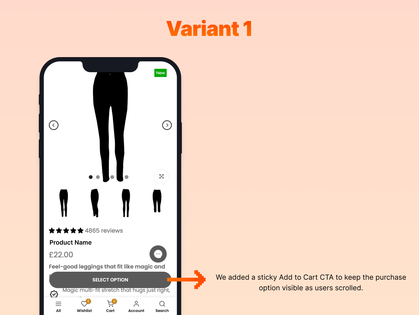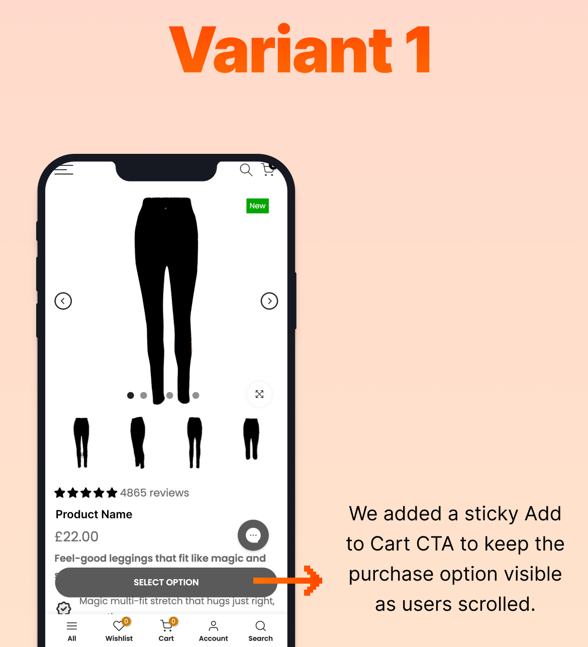 We analysed this test two weeks after implementation. The results displayed that shoppers with the sticky CTA in place were far more likely to convert. Conversion Rate increased substantially and users spent more time on site too, with both Revenue per User and Average Order Value rising by more than 26% and 7%, respectively. Engagement deeper in the funnel also improved, as more visitors clicked through to checkout and used the standard Add to Cart button, while Bounce Rate also dropped.