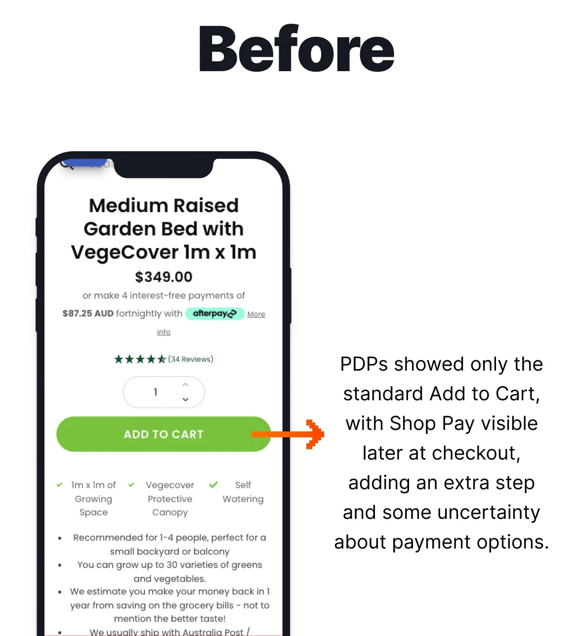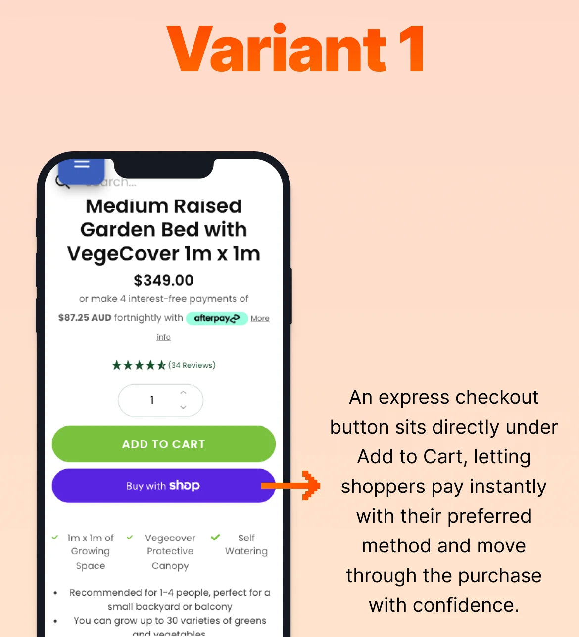 The addition of the express checkout CTA produced strong results across all key metrics. The uplift suggested that introducing express checkout at the point of evaluation accelerated commitment momentum, allowing ready-to-buy users to bypass intermediate steps without disrupting consideration-led users. Results included +35.8% increase in Conversion Rate, +40.13% in Revenue per Visitor, +3.19% in Average Order Value, +12.20% in Average Units per Order, and even a -24.23% decrease in Abandoned Checkout Rate. These outcomes highlighted that faster access to checkout not only boosted conversions but also encouraged larger orders and increased brand trust. Beyond speed alone, the visible presence of Shop Pay acted as a trust amplifier, signalling secure, recognisable payment infrastructure and strengthening purchase confidence directly on the PDP. With a 99.36% statistical significance, we set this variation live.