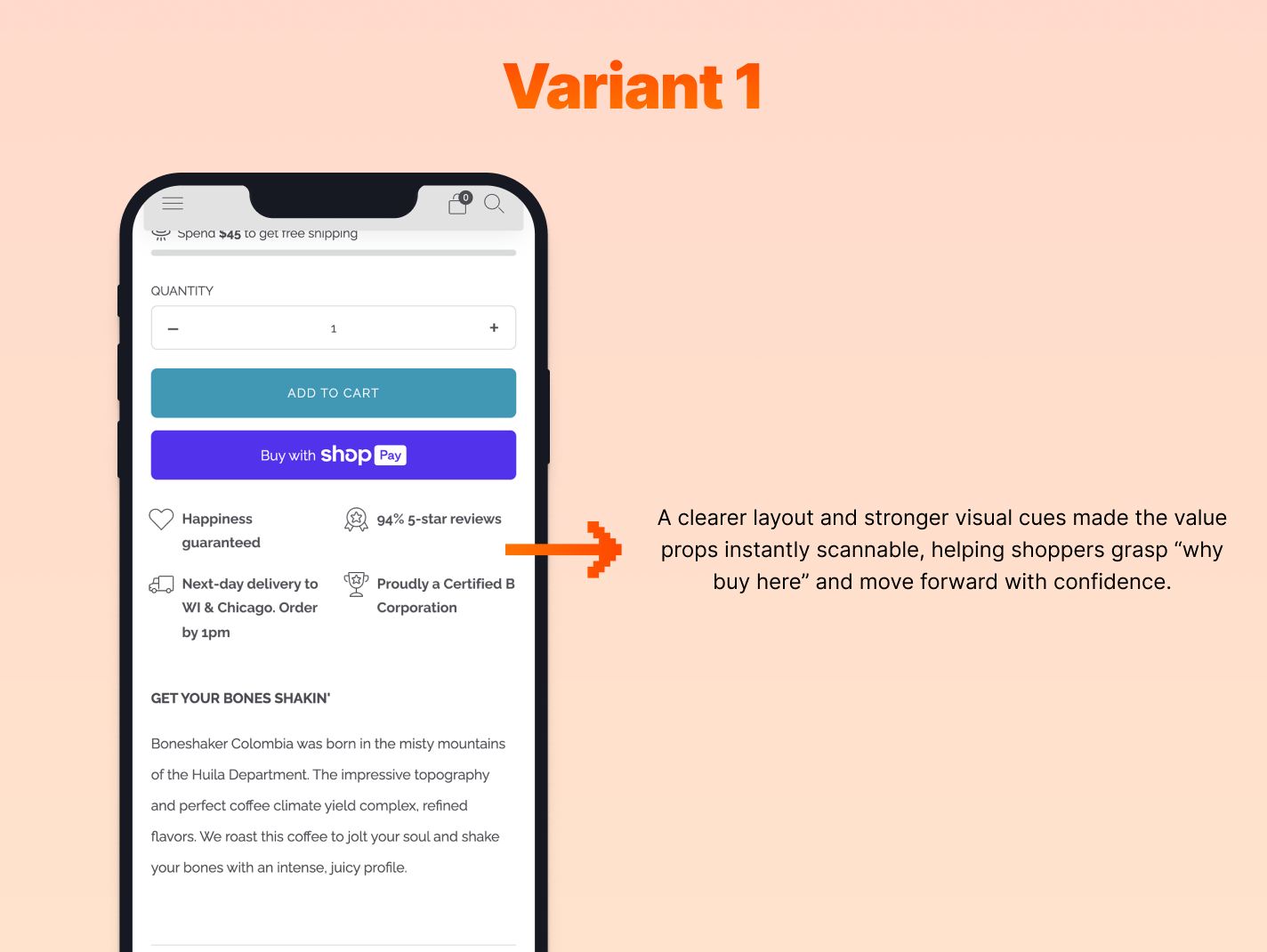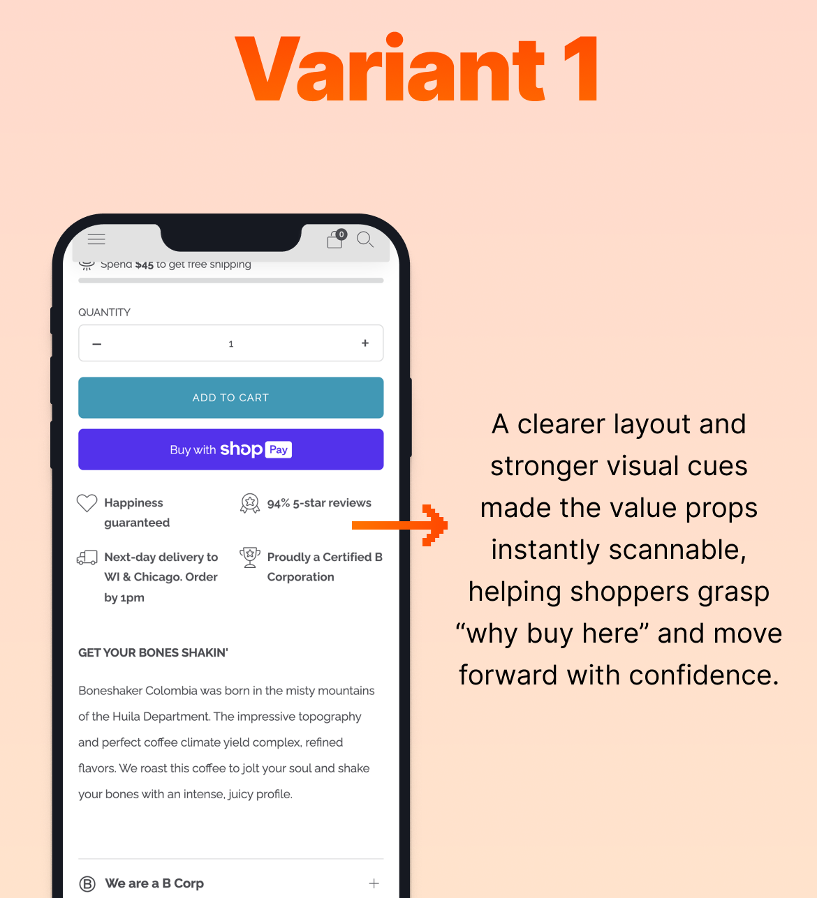 The results showed significant improvements across the board. Variant 1 outperformed the original with an 11.93% uplift in Revenue per Visitor, a 6.41% increase in Conversion Rate, and an 8.35% boost in Add to Cart Rate. Subscription metrics were particularly impressive, with a 48.33% increase in Subscription Orders per Visitor and a 42.91% rise in Subscription Revenue per Visitor. With statistical significance achieved, we implemented Variant 1 permanently.