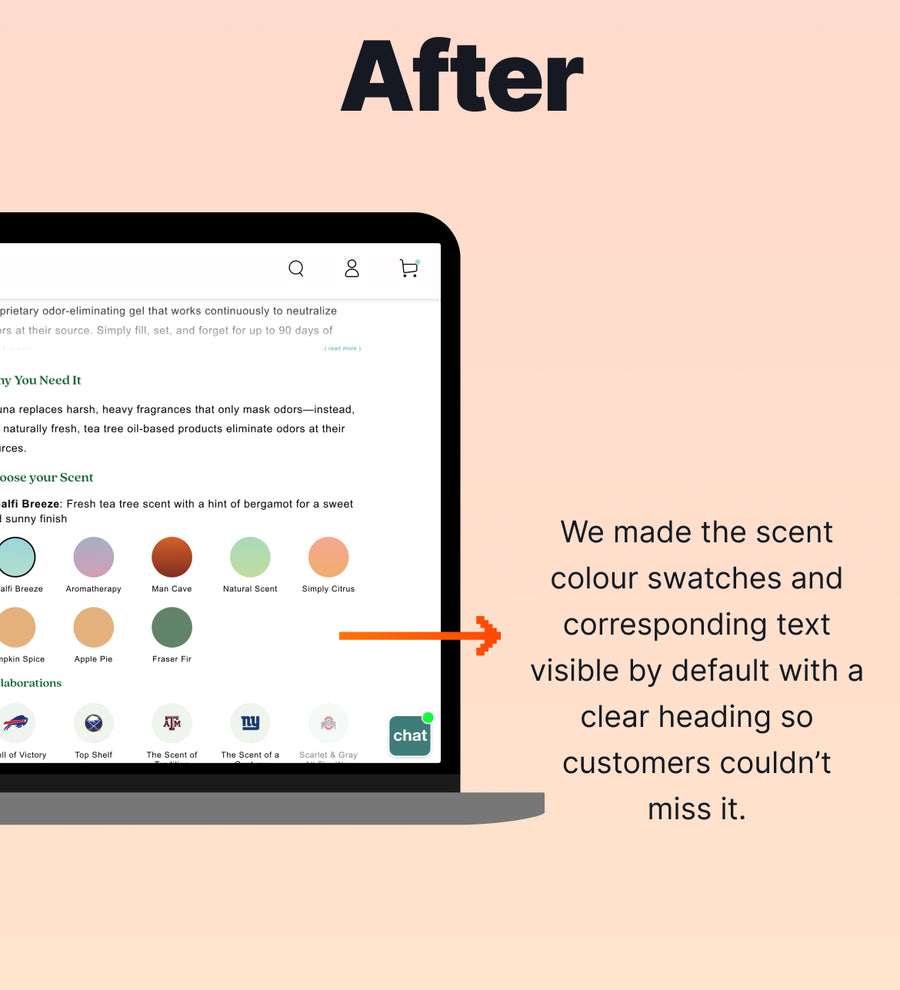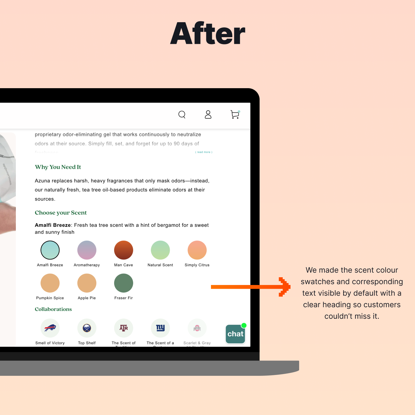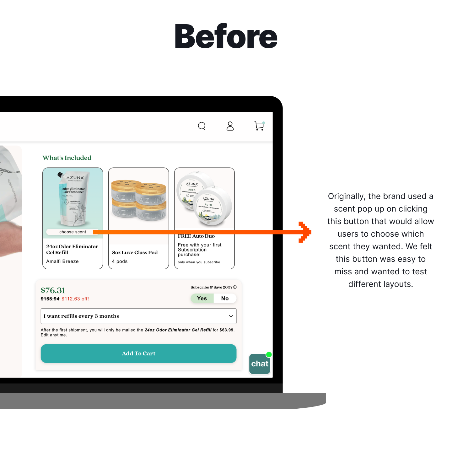 As with all new clients, we began our work with Azuna by conducting a CRO Audit - reviewing performance data, previous tests, and user behaviours. During this process, we evaluated earlier tests run on the Intelligems platform and identified an opportunity to improve how product variants were displayed on the PDP. Previous versions used a dropdown menu to show scent options, but our analysis suggested that this design could limit visibility and hinder product discovery.